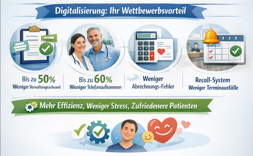 Eine digitalisierte Zahnarztpraxis ist nicht nur effizienter, sondern auch attraktiver für Patienten. Wer moderne Technologien einsetzt, positioniert sich als innovativ und zukunftsorientiert. Gerade in einem zunehmend wettbewerbsintensiven Umfeld ist dies ein entscheidender Vorteil.